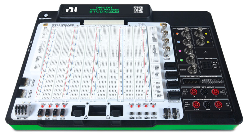 The Analog Discovery Studio Max (ADS Max) is a comprehensive electronics laboratory solution designed for academic instruction and hands-on learning. Equipped with 14 built-in instruments, supporting everything from a multimeter and bode plots to digital protocol generation and spectral analysis, the ADS Max is ideal for circuit design, signal analysis, and embedded systems coursework. With a variety of removable and curriculum tailored Canvas boards to enhance its functionality, the ADS Max enables dynamic, hands-on experiences in both classroom and remote learning environments.